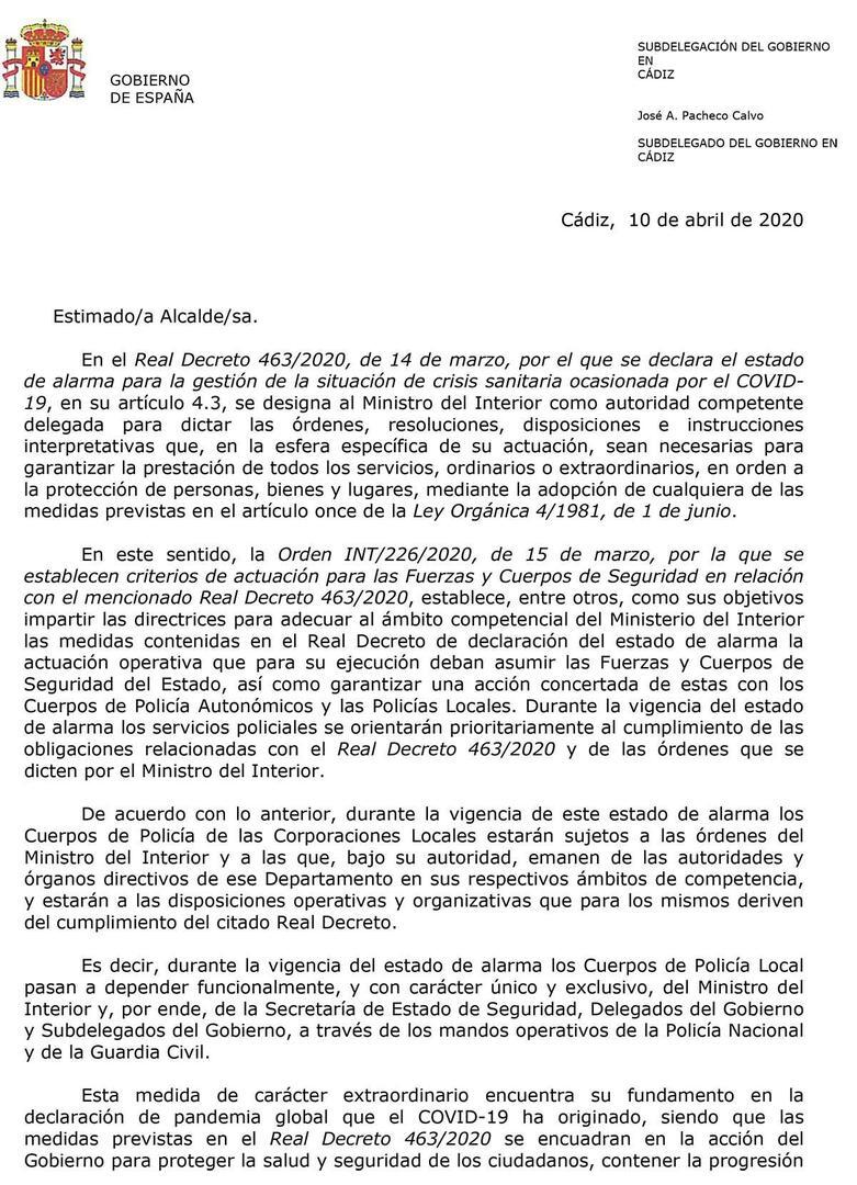 Aprovechan en la carta enviada a los municipios españoles que la dirección de los mimos ya no dependen de los Ayuntamientos, sino del Ministerio de Interior: "durante la vigencia de este estado de alarma los Cuerpos de Policía de las Corporaciones Locales estarán sujetos a las órdenes del Ministro del Interior, es decir, durante la vigencia del estado de alarma los Cuerpos de Policía Local pasan a depender funcionalmente, y con carácter único y exclusivo, del Ministro del Interior y, por ende, de la Secretaría de Estado de Seguridad, Delegados del Gobierno y Subdelegados del Gobierno, a través de los mandos operativos de la Policía Nacional y de la Guardia Civil. Cualquier actuación de las contempladas más allá de la normativa de Fuerzas y Cuerpos de Seguridad deberá estar coordinada por dichos mandos".