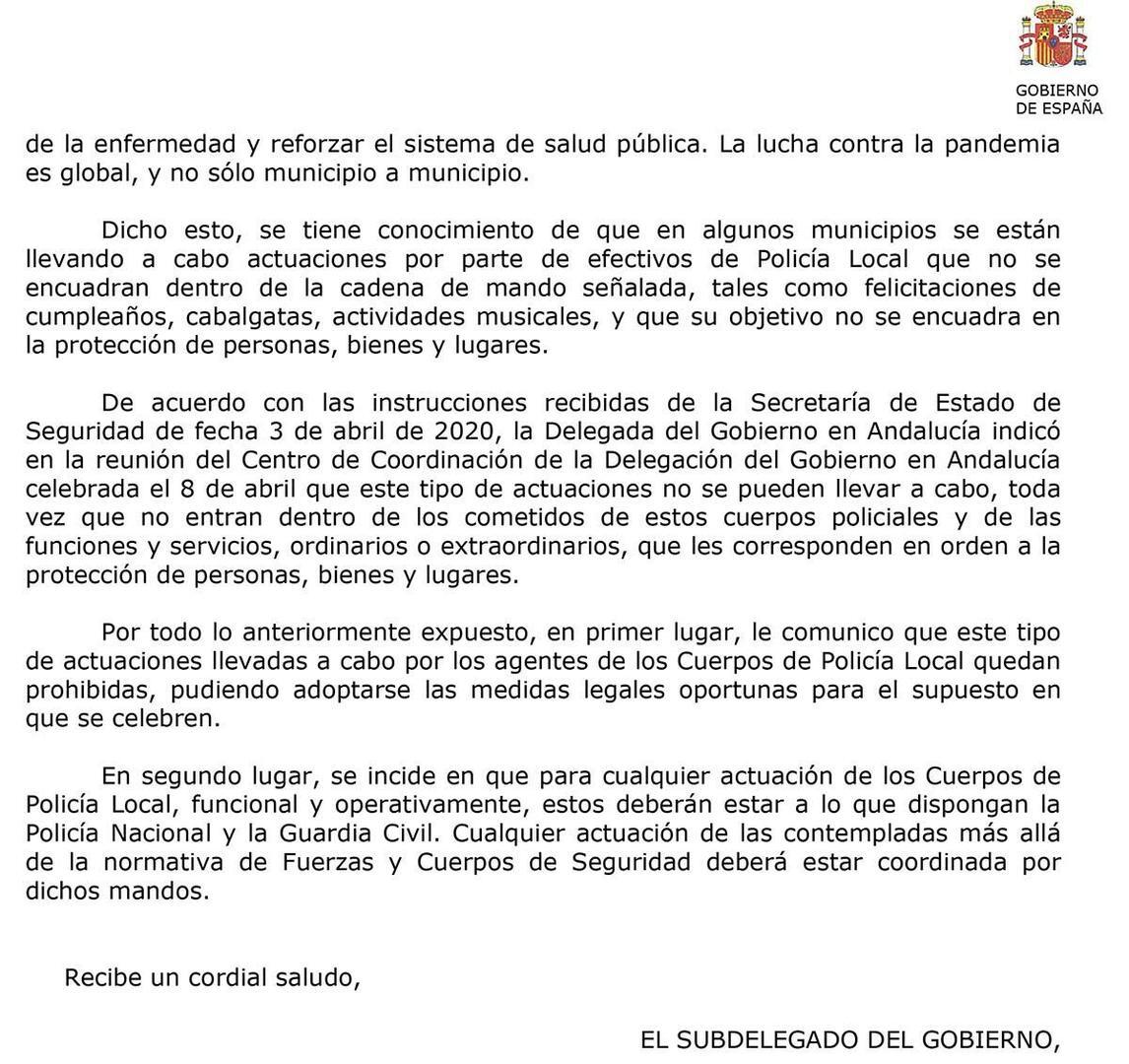 Ante tal iniciativa de los agentes municipales, deciden prohibirlas, y que se limiten a las actuaciones meramente policiales de protección de personas y bienes: "De acuerdo con las instrucciones recibidas de la Secretaría de Estado de Seguridad de fecha 3 de abril de 2020, la Delegada del Gobierno en Andalucía indicó en la reunión del Centro de Coordinación de la Delegación del Gobierno en Andalucía celebrada el 8 de abril que este tipo de actuaciones no se pueden llevar a cabo, toda vez que no entran dentro de los cometidos de estos cuerpos policiales y de las funciones y servicios, ordinarios o extraordinarios, que les corresponden en orden a la protección de personas, bienes y lugares".