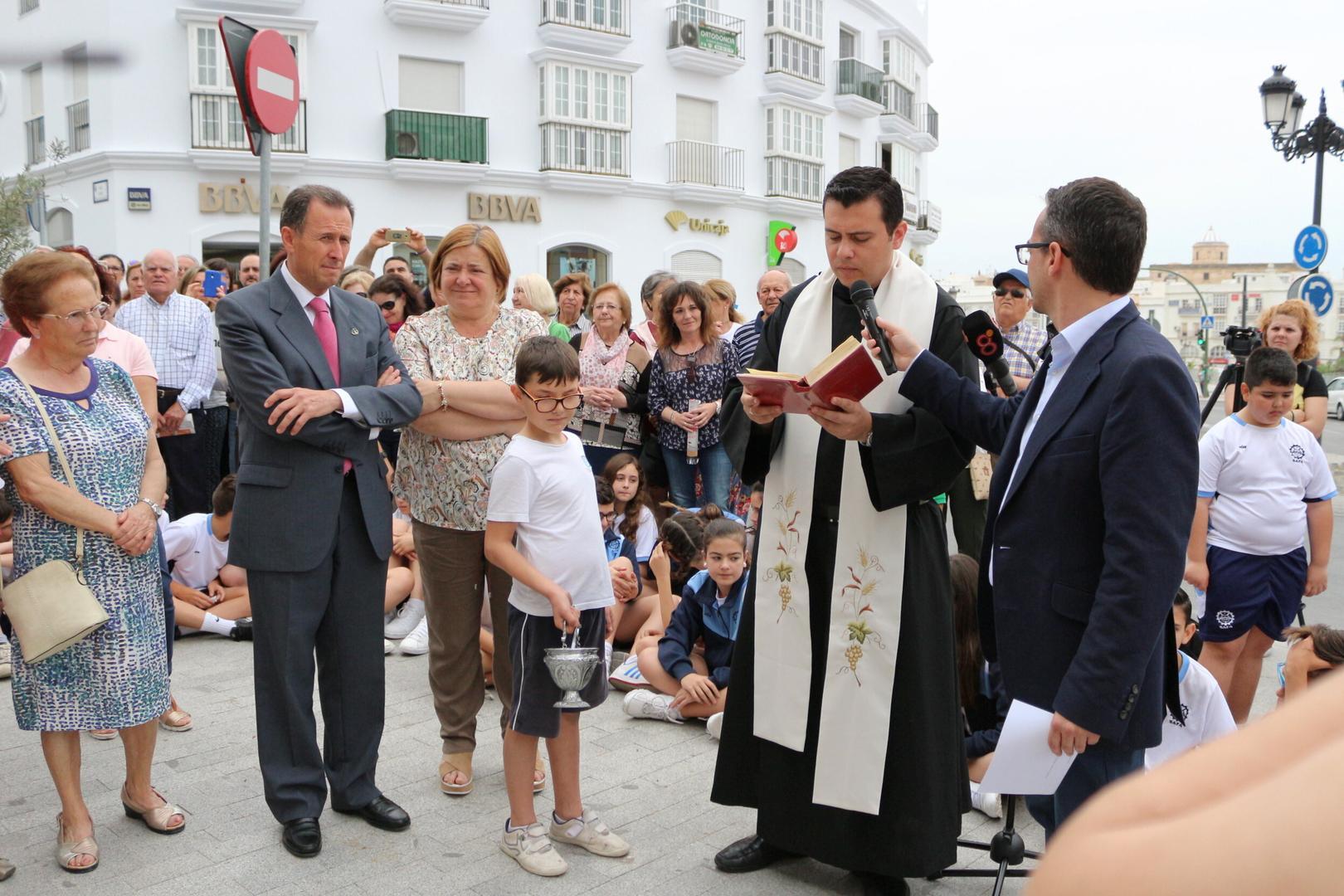 El padre Gustavo Camarena ha sido el encargado de bendecir la estatua en esta nueva localización, un evento que sirve como pistoletazo de salida a la celebración de los actos con motivo este año del 75 aniversario de la llegada de las Hermanas de la Cruz a Chiclana.