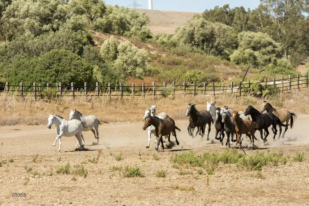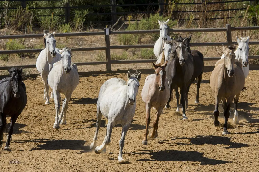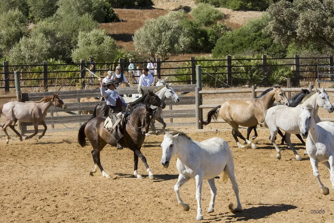 Pero a lo lejos se divisa una manda de yeguas con sus potros que se aproximan al picadero acompañados por cuatros jinetes jóvenes de la familia Domecq. Para asombro de todos los asistentes se ven caballos de pura raza con su pelaje al viento trotando para llegar al picadero. Pura naturaleza al galope. Caballos de pura raza, caballos conocidos mundialmente por su capa torda, pero no podemos olvidar esa gama de colores que hace a cada uno especial. Una imagen en el picadero fantástica y centro de todas las miradas y numerosos comentarios acerca de su belleza.