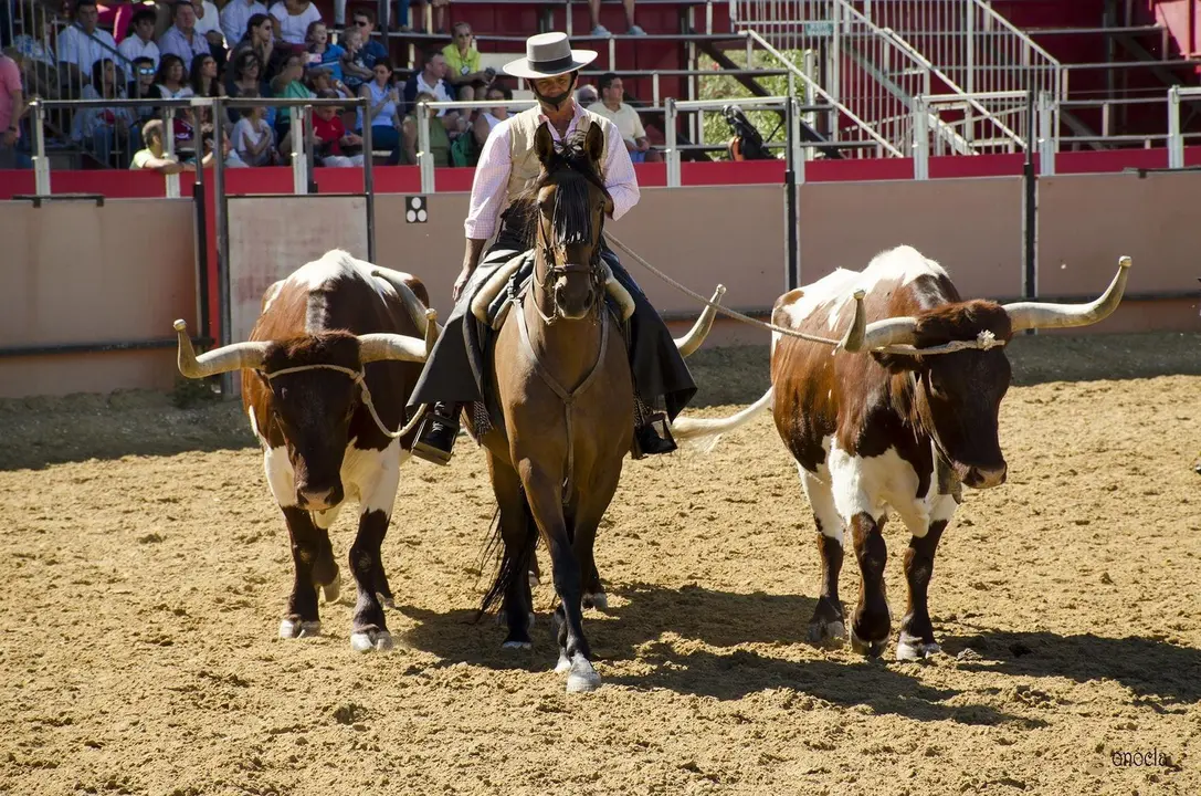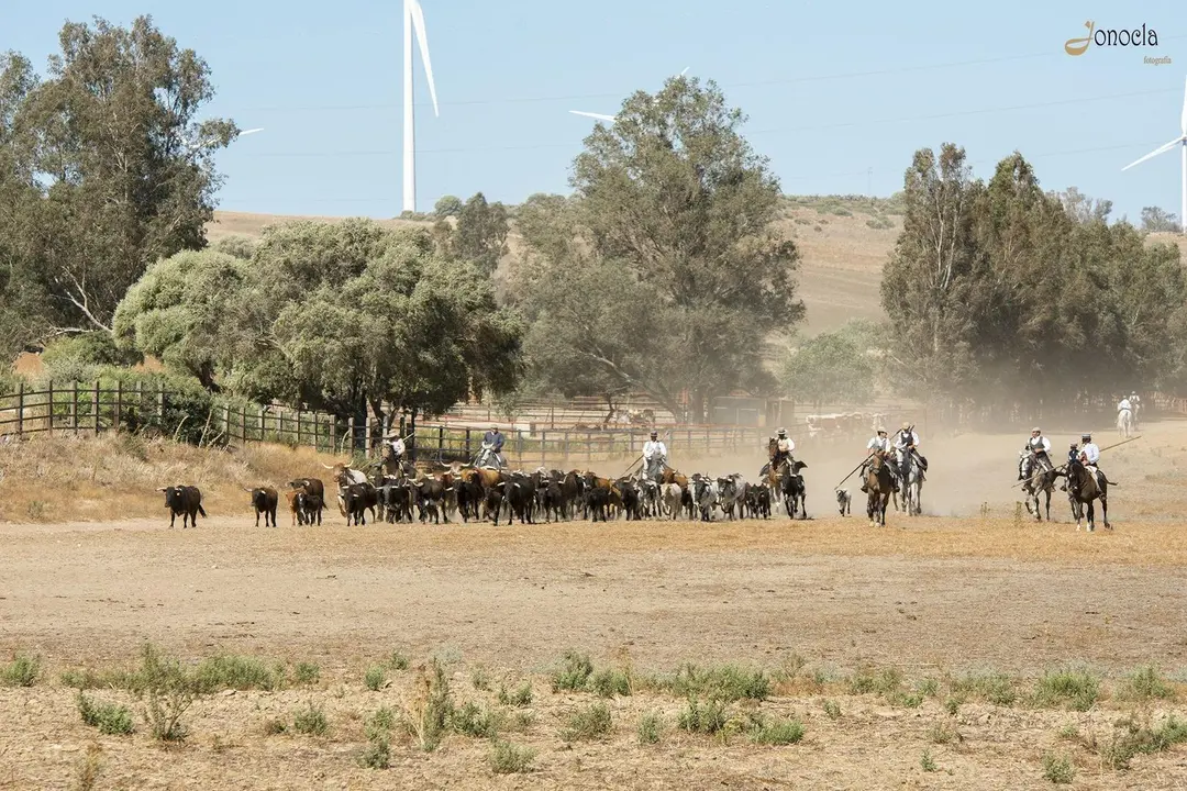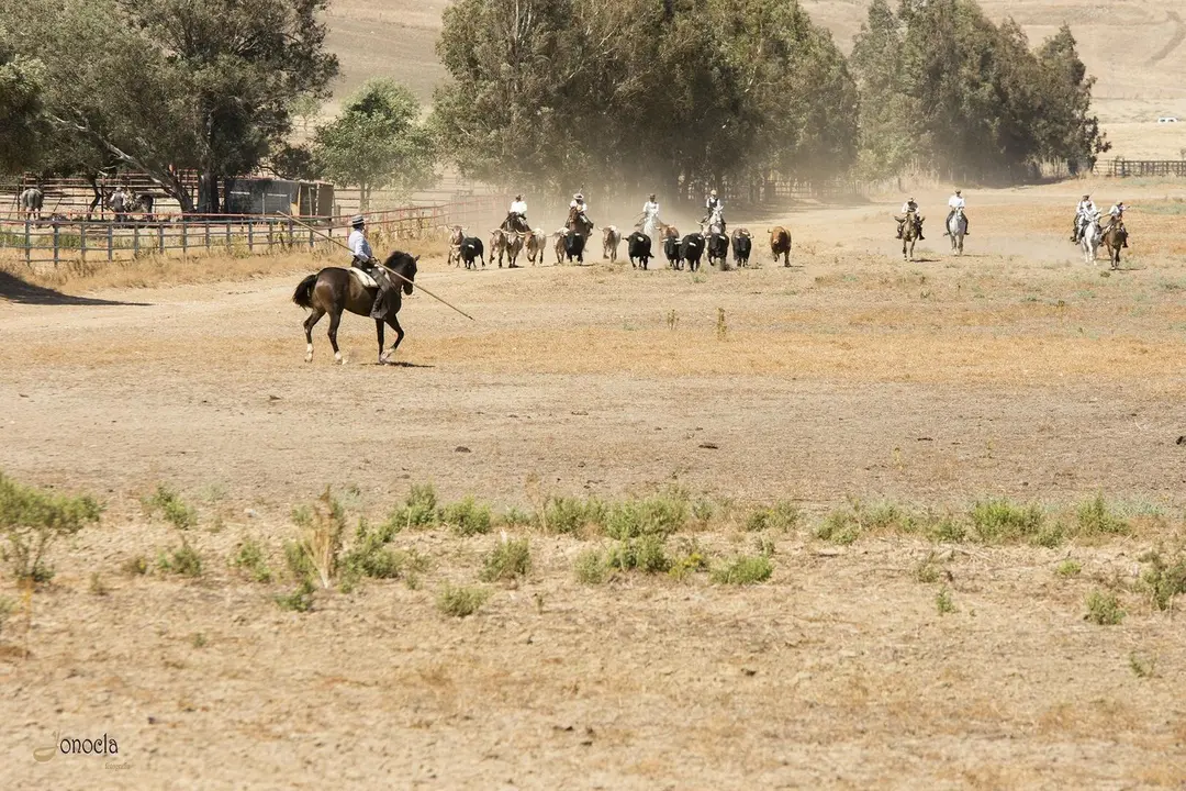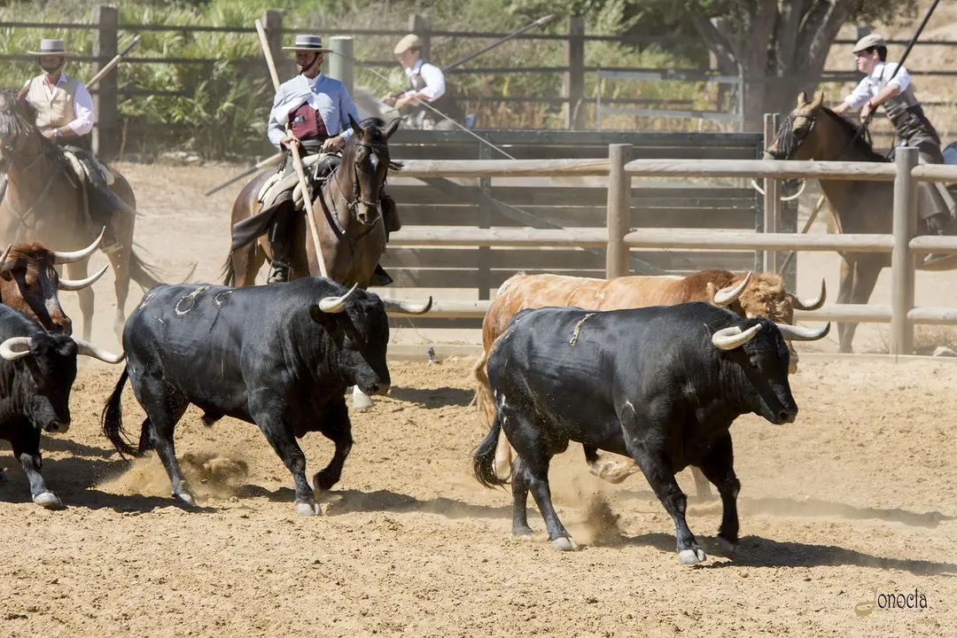Una vez conocidas las diferentes señas de identidad, pudimos ver una de las estampas más esperadas. Una de las imágenes más espectaculares es la llegada del ganado vacuno recorriendo varios cientos de metros al galope hasta llegar al picadero. Varios jinetes escoltan a un lote de vacas con el semental y sus becerros, dejando atrás esa inmensa cortina de humo. El guía, mientras, nos explica que este ganado puede tener diferentes tonalidades con su pelaje: principalmente es negro, blanco y colorado, aunque luego podemos ver mezcla de ellos. Los jinetes, con estoque en mano, hacen que el ganado recorra el picadero para poder ser visto por todos los asistentes y que nadie pierda detalle.