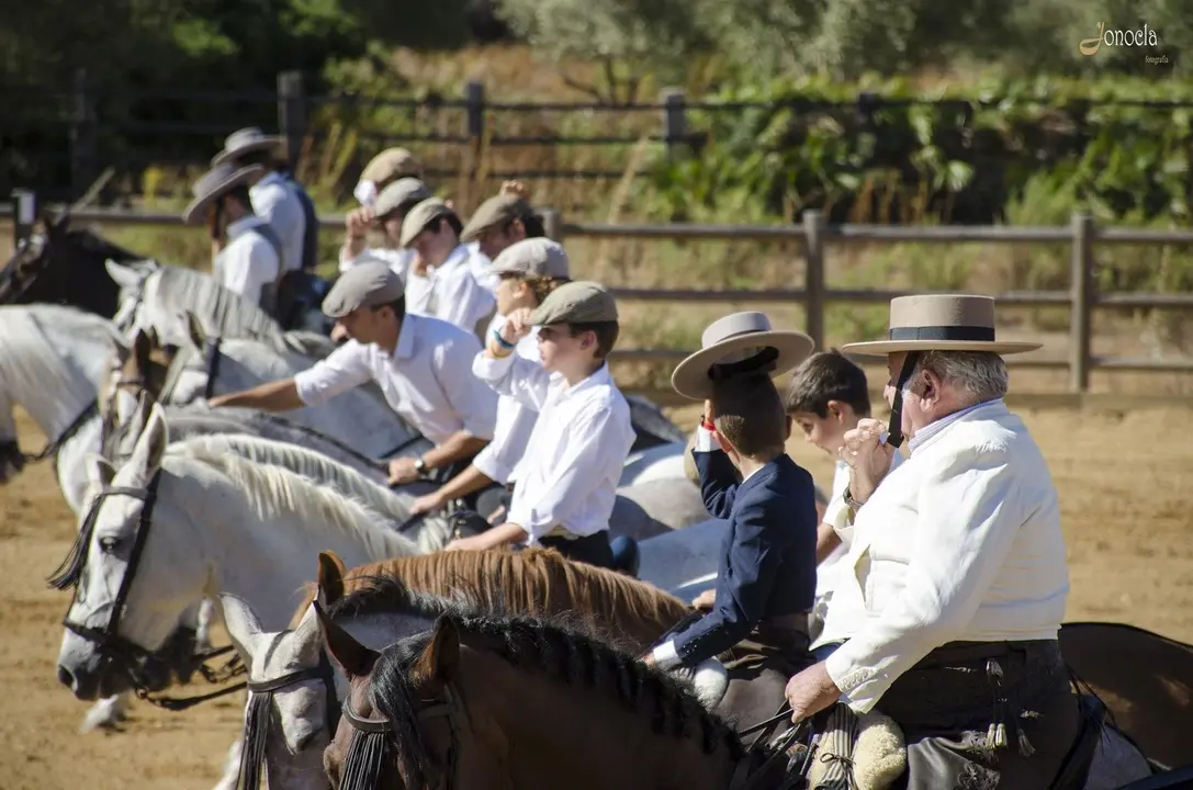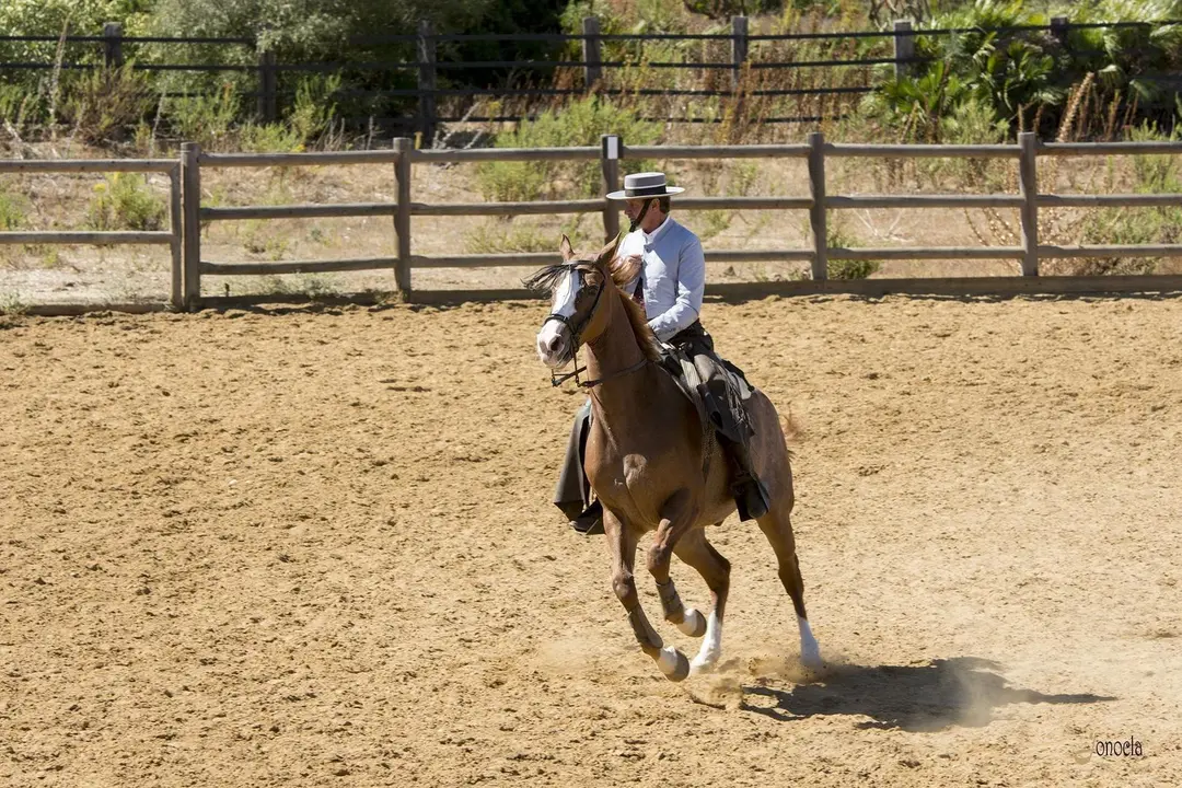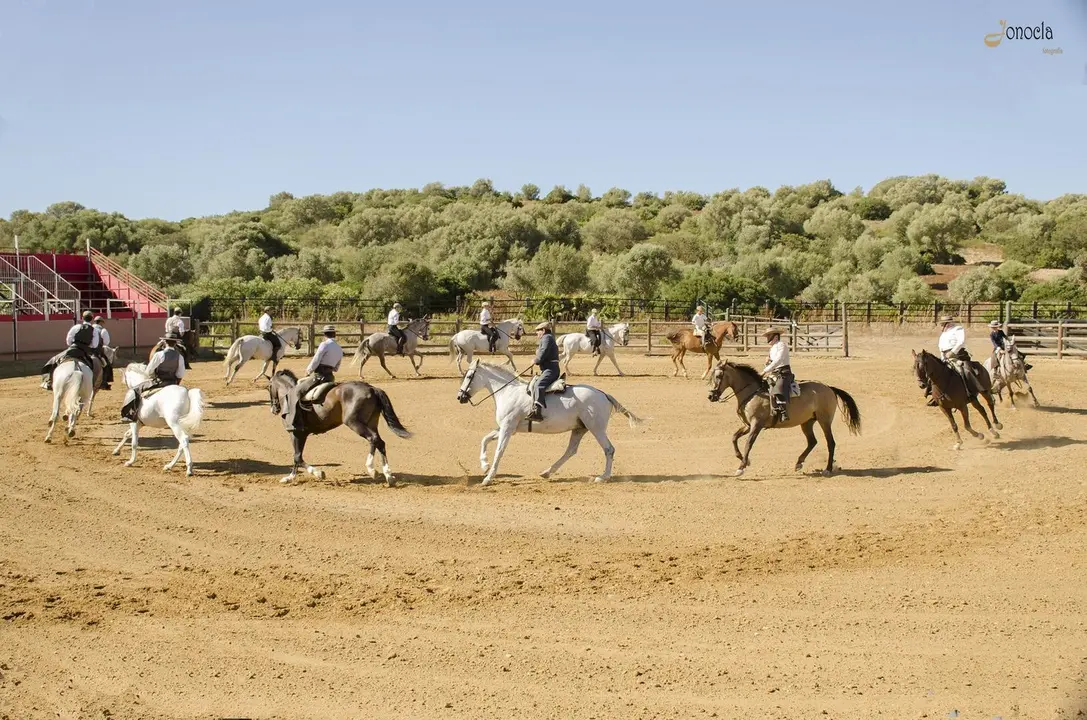 Una vez acaba el sendero, llegas a tu destino. Una plaza semicircular que va llenándose de todos los espectadores que vienen a disfrutar del espectáculo, que en esta ocasión dedica solidariamente la recaudación de las entradas a beneficio de UPACE. Unas gradas en las que poco a poco no va quedando hueco y en la que todos tienen la mirada puesta en la misma dirección. Al fondo, un paisaje digno de mención. Una estampa inmejorable, armonía de colores en el campo, y a lo lejos, de manera alineada, los jinetes con sus caballos dispuestos a cabalgar por esa dehesa que conforma la finca Los Alburejos. Es la primera imagen impactante de las muchas que podremos encontrar a lo largo del “show”.