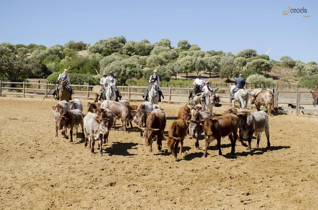 Nuestro destino es ver “A Campo Abierto”, desplazarnos para conocer una ruta del toro en la que podremos ver al toro bravo, un lote de vacas con el semental y sus becerros, cabestros en su trabajo habitual de guías, destete de becerros, yeguas con los potros y jinetes y caballos trabajando en doma vaquera y alta escuela española. Si indagas en su web eso es lo primero que puedes leer: “vivir un día inimaginable en la libertad del campo andaluz”. Palabras que por sí solas despiertan curiosidad por saber qué vas a encontrar en estos parajes en la finca Los Alburejos.