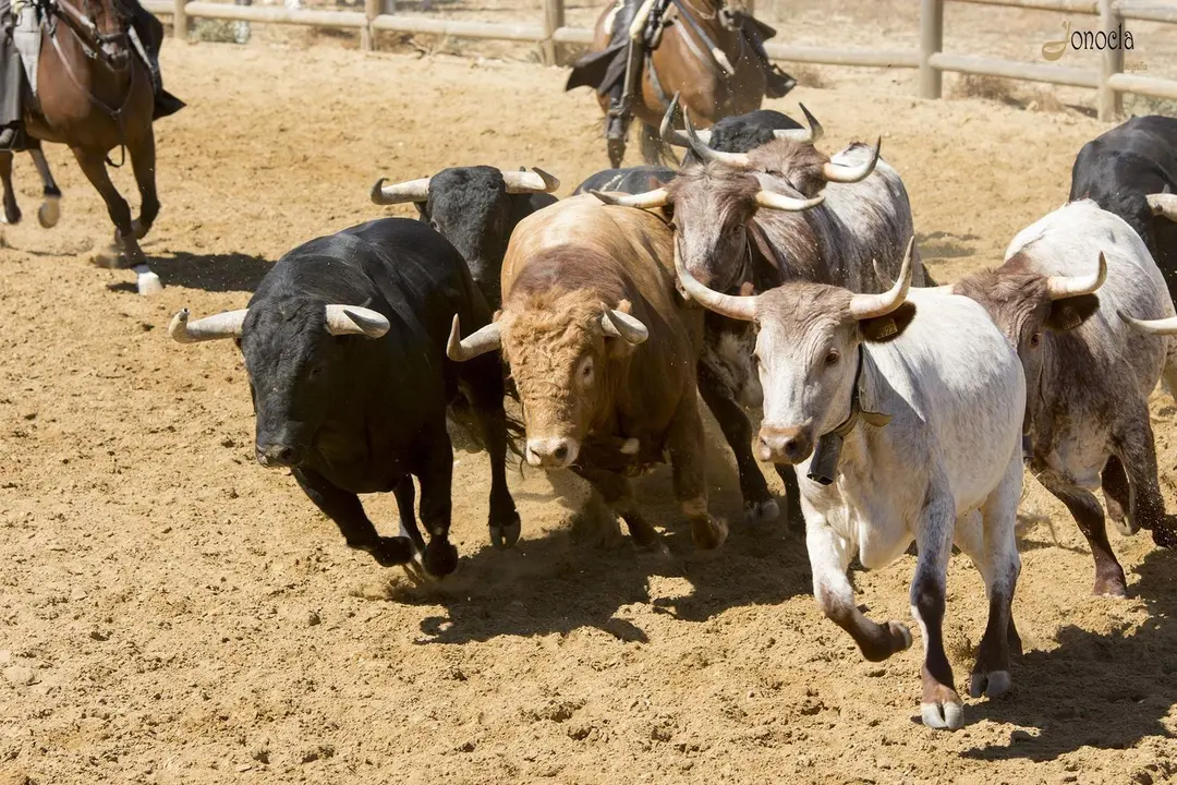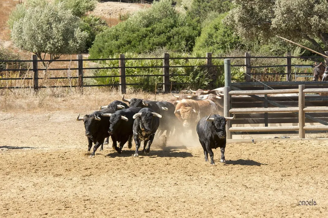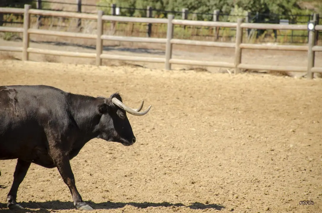 Y por fin vemos al final de la dehesa al toro bravo. Con esos colores oscuros. Con esa bravura. Con ese porte. Con esa mirada firme. Con ese don de grandeza. Se dirige al picadero para mostrarnos su bravura dejando atrás un manto de polvo. Cuando llega, muestra su elegancia con ese color negro azabache, con unos cuernos grandes hacia delante y un potente aparato locomotor. Da muestra de ser fuerte y tener un gran temperamento. De ser desconfiado, pero con un instinto agudizado. Pero una vez mostrado, necesita volver a su hábitat natural, vivir en la libertad del campo andaluz.