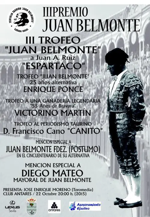 El III Trofeo “Juan Belmonte”, como galardón principal de la Tertulia, ha ido a parar este año a manos de Espartaco, que lo recibió del alcalde de Cañada Rosal. Expresó, en broma, que este trofeo le correspondía a él por sus muchas relaciones con la figura de Belmonte, una de ellas es que se llama Juan por homenaje de su padre al Pasmo.