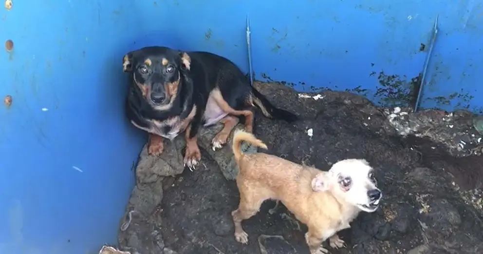 Abandonan a dos perros desnutridos en un contenedor de basura al sol