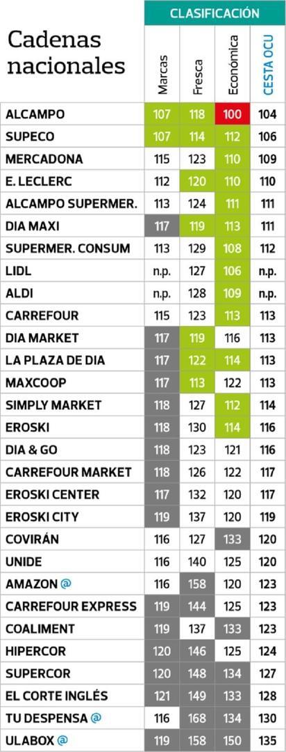 A nivel nacional, Alcampo mete el turbo, Mercadona continúa en el camino, y Carrefour abandona la lucha. En este estudio de la OCU figuran noventa cadenas, es decir, noventa enseñas que tienen al menos dos tiendas diferentes que han sido visitadas y tenían suficientes precios para darles un índice. Alcampo ha hecho este año un esfuerzo por rebajar sus precios, que ha movido la alfombra a toda la clasificación.