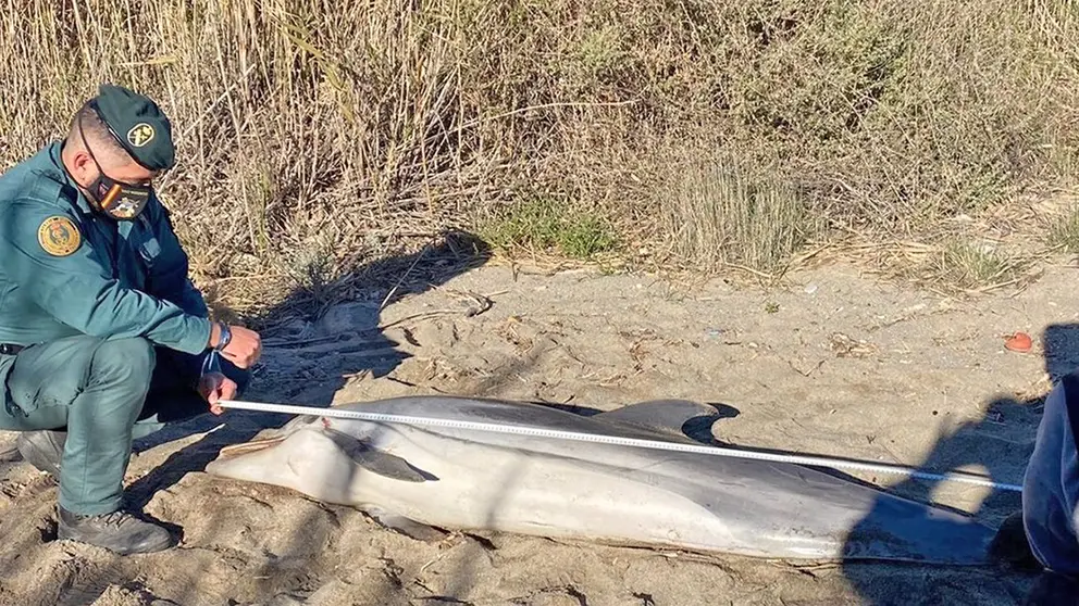 La Guardia Civil ha prestado apoyo Equinac en el varamiento de un delfín en la desembocadura del río Aguas en Mojácar (Almería), en la playa de la Marina de la Torre.