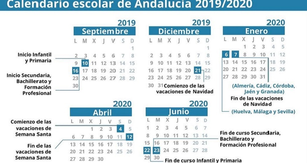 Las vacaciones de Navidad comenzarán en toda Andalucía el 21 de diciembre pero terminarán en fechas distintas según la provincia: el 6 de enero en Huelva, Málaga y Sevilla; y el 7 de enero en Almería, Cádiz, Córdoba, Jaén y Granada. Las vacaciones de Semana Santa serán igual en toda la región, del 4 al 12 de abril.