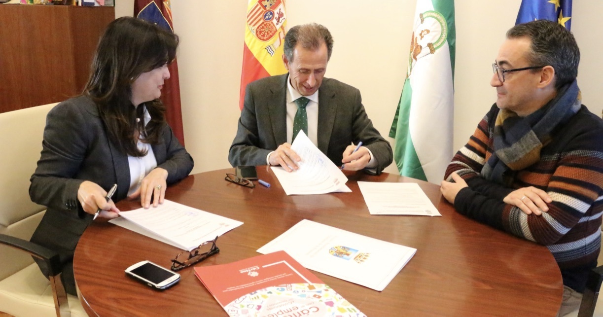 El alcalde José María Román y la directora de Cáritas Diocesana de Cádiz firman el convenio