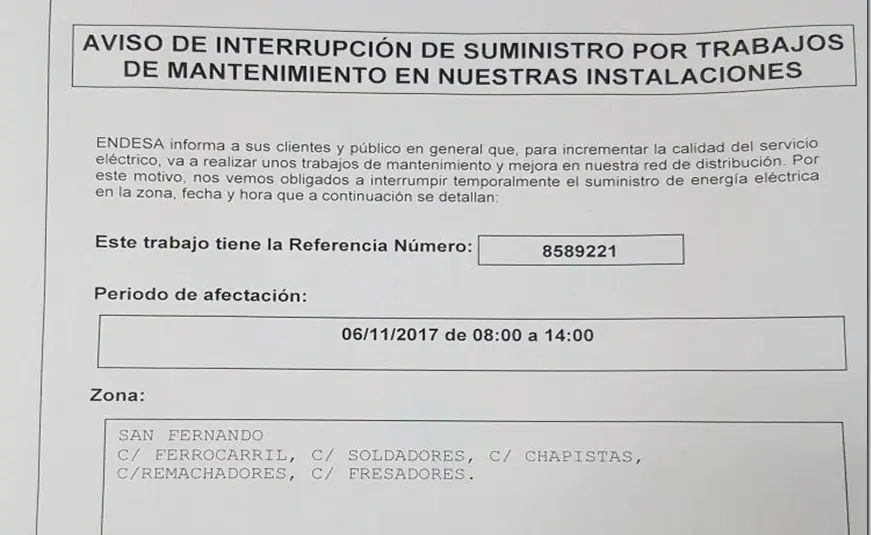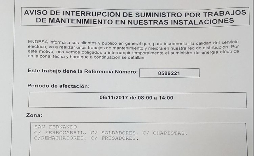 ENDESA vuelve a anunciar un corte de luz un día laborable en el Polígono Industrial FADRÍCAS I para el lunes día 6, de 8,00 h. a 14,00 h., en las calles: Ferrocarril, Soldadores, Chapistas, Remachadores y Fresadores, que afectarán a unas 60 naves industriales aproximadamente, con la consiguiente pérdida económica en horas de trabajo y de negocio en las industrias y comercios alojados en dichas naves.