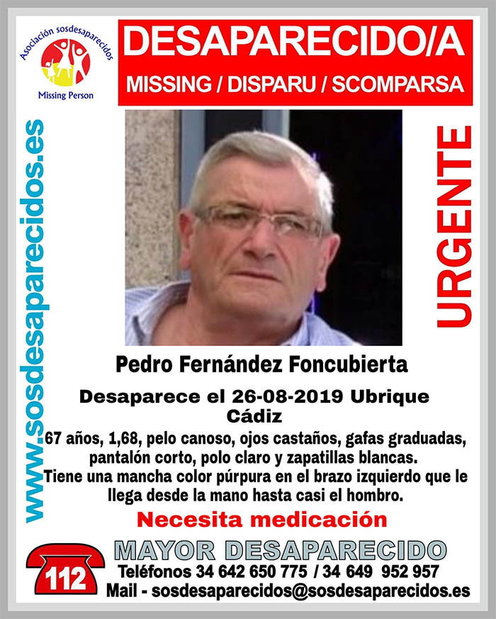 La Asociación SOS Desaparecidos solisicta la ayuda para encontrar a Pedro Fernández Foncubierta, un varón de 67 años de edad que lleva desaparecido desde el lunes en Ubrique, localidad de la Sierra de Cádiz.