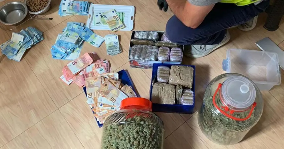 Durante el registro llevado a cabo en el punto de venta de droga, se intervinieron 400 gramos de hachís, una báscula de precisión, 39 bolsitas con 15 gramos de marihuana cada una de ellas, 41 gramos de cocaína y dinero fraccionado.