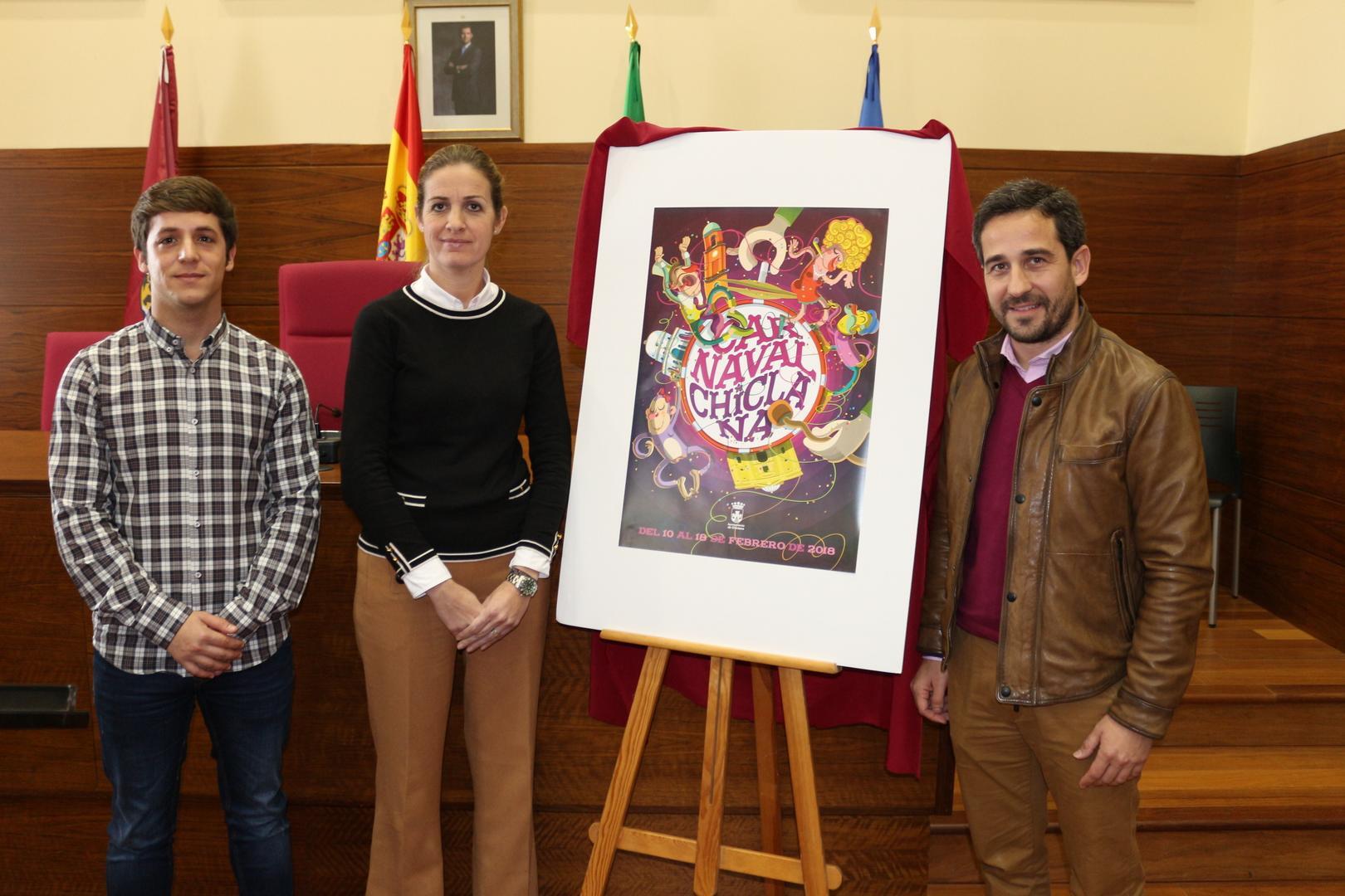 El delegado municipal de Fiestas, José Manuel Vera, acompañado de la primera teniente de alcalde, Carmen Jiménez, y del delegado de Juventud, José Alberto Cruz, ha presentado el cartel anunciador y la programación del Carnaval de Chiclana 2018. Así, en cuanto al cartel, obra del diseñador gráfico Antonio Vela, el responsable del área ha agradecido “el magnífico trabajo del artista chiclanero, ya que tiene mucho colorido y alegría. Así, se refleja la seña de identidad de Antonio Vela”.