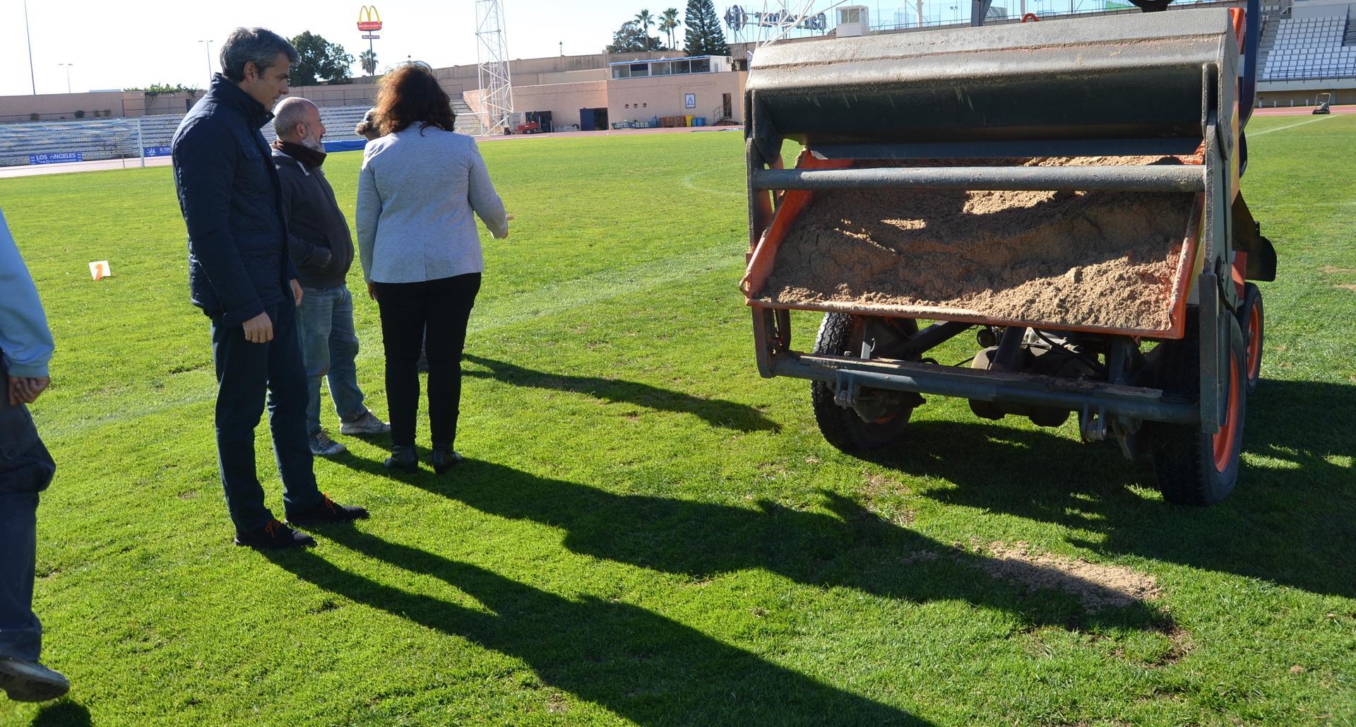 El primer teniente de alcaldesa y delegado general del Área de promoción de la Ciudad, Fran Romero, y la delegada municipal de Deportes, Maite Lebrero, han visitado esta mañana el Estadio Iberoamericano de la Ciudad Deportiva de Bahía Sur para supervisar el avance de las tareas de resiembra que durante esta semana se desarrollan en este espacio. Dichas tareas se ejecutan mediante medios mecánicos y manuales y aprovechando que el San Fernando CD juega su próximo partido fuera de casa y que luego llega el descanso de Liga.