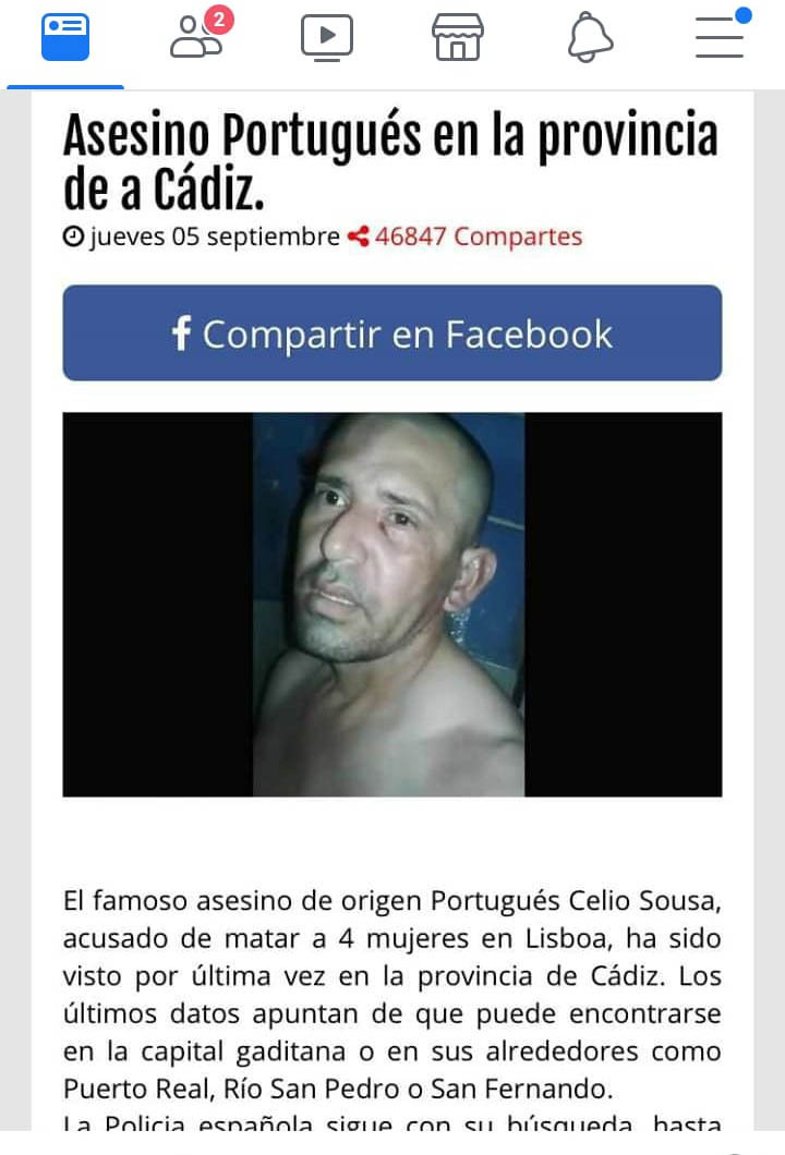En la noticia, cuyo título es "Asesino portugués en la provincia de Cádiz", se informa que "el famoso asesino de origen portugués Celio Sousa, acusado de matar a cuatro mujeres en Lisboa, ha sido visto por última vez en la provincia de Cádiz".