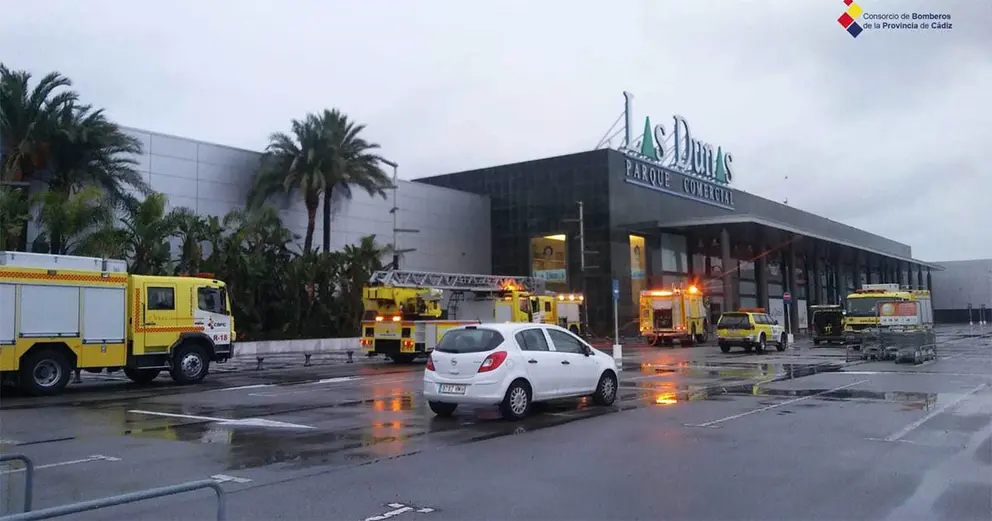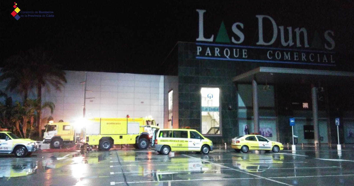 Bomberos del Parque de Sanlúcar, con colaboración de los parques de Jerez y El Puerto, han intervenido desde las 05:10 horas de la madrugada del domingo en el incendio originado en el Centro Comercial Las Dunas de Sanlúcar de Barrameda.