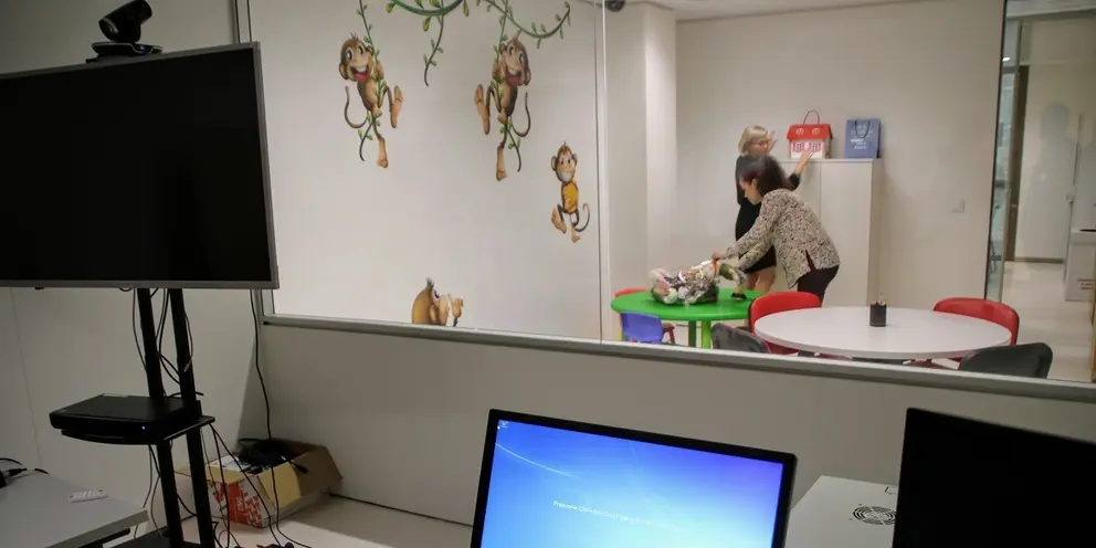 Este espacio está dotado de sistema de grabación audio/video, así como interconectada por audio con la zona de observación lo que permite la interactuación del juez/a con la persona que está realizando la diligencia. Existe también la posibilidad de realizar la observación remotamente a través de videoconferencia desde la sala de vistas.