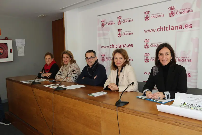 El delegado municipal de Servicios Sociales, Francisco José Salado; la delegada municipal de Salud, Mª Ángeles Martínez Rico, y la presidenta de la Asociación Española Contra el Cáncer, Isabel Montero; la coordinadora de voluntariado de la AECC en la provincia, María Arango, y la coordinadora del proyecto, Susana Pedreño, han presentado el programa de Voluntariado Domiciliario, un nuevo recurso social dirigido a aquellas personas que sufren esa temida enfermedad llamada cáncer y a sus familiares.