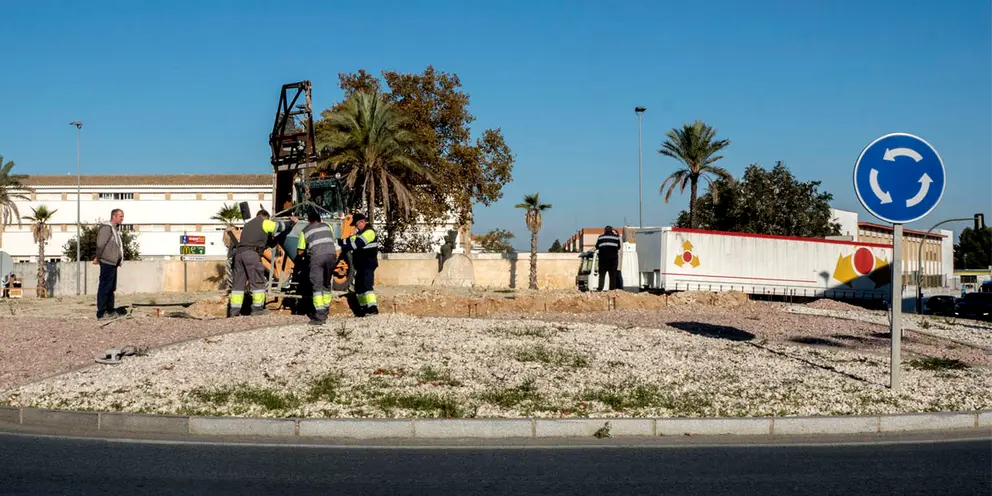 La Delegación de Infraestructuras está llevando a cabo trabajos de adecentamiento y mejora de la glorieta de entrada a la ciudad por El Palmar, donde se va a instalar un gran letrero con el nombre de la localidad.