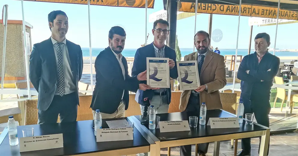Barbate ha dado un paso más en su consolidación como destino turístico de referencia con la obtención de la certificación Q de Calidad Turística a las playas del Carmen y Zahara de los Atunes, una distinción otorgada por el Instituto de Calidad Turística Español (ICTE), dependiente del Ministerio de Energía, Turismo y Agenda Digital. La certificación ha sido entregada hoy, 13 de noviembre, en un acto que ha estado presidido por el alcalde, Miguel Molina, y el delegado municipal de Turismo, Javier Rodríguez. También han intervenido en el evento Adrián Macías, director de Q-Innóvate, encargada de la redacción del proyecto junto al Ayuntamiento de Barbate, y Raul Mesa, director de Oca Cert, empresa responsable de la auditoría para la obtención de la Q de Calidad Turística.