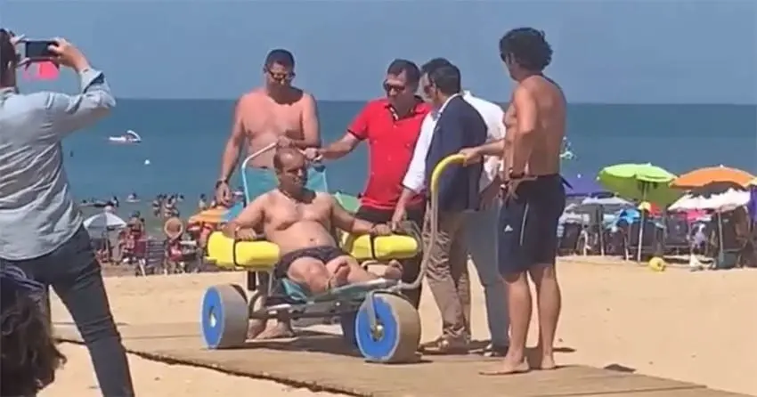 En un vídeo que han filmado personas con discapacidad que sí sufren de movilidad reducida, asombradas por lo que estaban viendo, se ve a Gallardo junto a una persona posando mientras va montada en un buggy para playa. De repente, tras unas palmadas del socialista, esta persona se levanta de la silla adaptada ante la sorpresa de todos y comienza a andar de vuelta con los políticos, hablando con naturalidad con ellos.