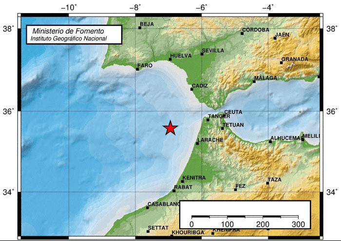 Según el Instituto Geográfico Nacional se ha producido un maremoto a las 22:36 horas del miércoles muy próximo al Golfo de Cádiz, (Latitud 35.5798 - Longitud -6.9438), alcanzando un magnitud de 4.6 grados y un origen a 51 kilómetros de profundidad.