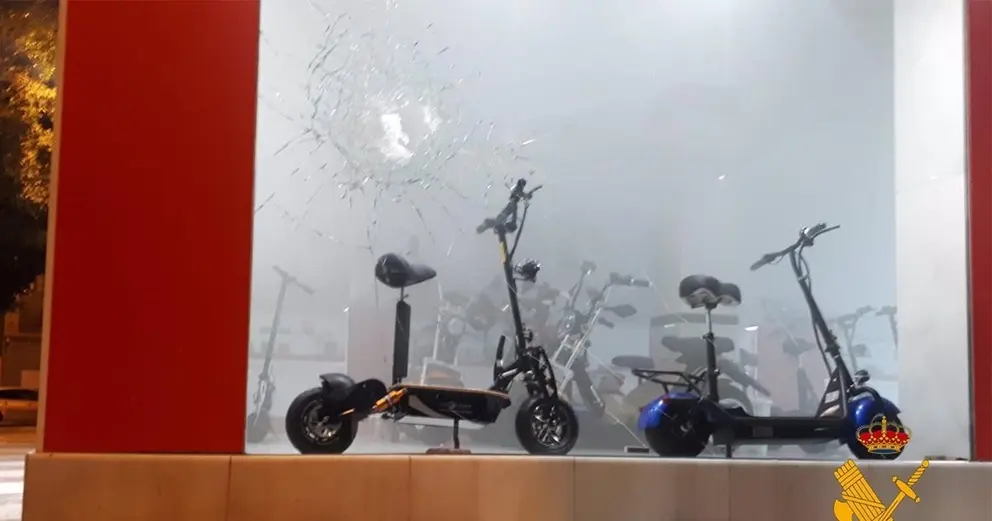 En la imagen, difundida por la Guardia Civil y recogida por elMIRA.es se aprecia nítidamente el impacto en el cristal de uno de los adoquines momentos antes de producirse el intento de robo en el establecimiento. Tras el mismo, se encuentran de patinetes eléctricos, objetivos por los que los sospechosos intentaron perpetrar el robo en la localidad almeriense de Roquetas de Mar.