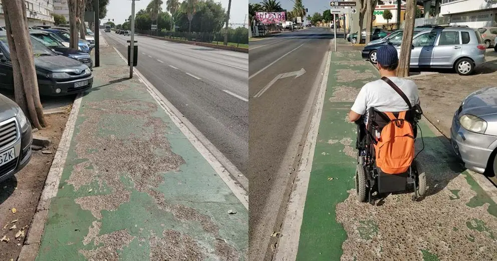 Por donde circulaba Navarrete el día del accidente era el trazado del carril bici de la avenida Pery Junquera. Él asegura que no hay acera y al otro lado hay una bolsa de aparcamientos, por lo que se ve obligado a coger por el carril bici con su silla de ruedas.