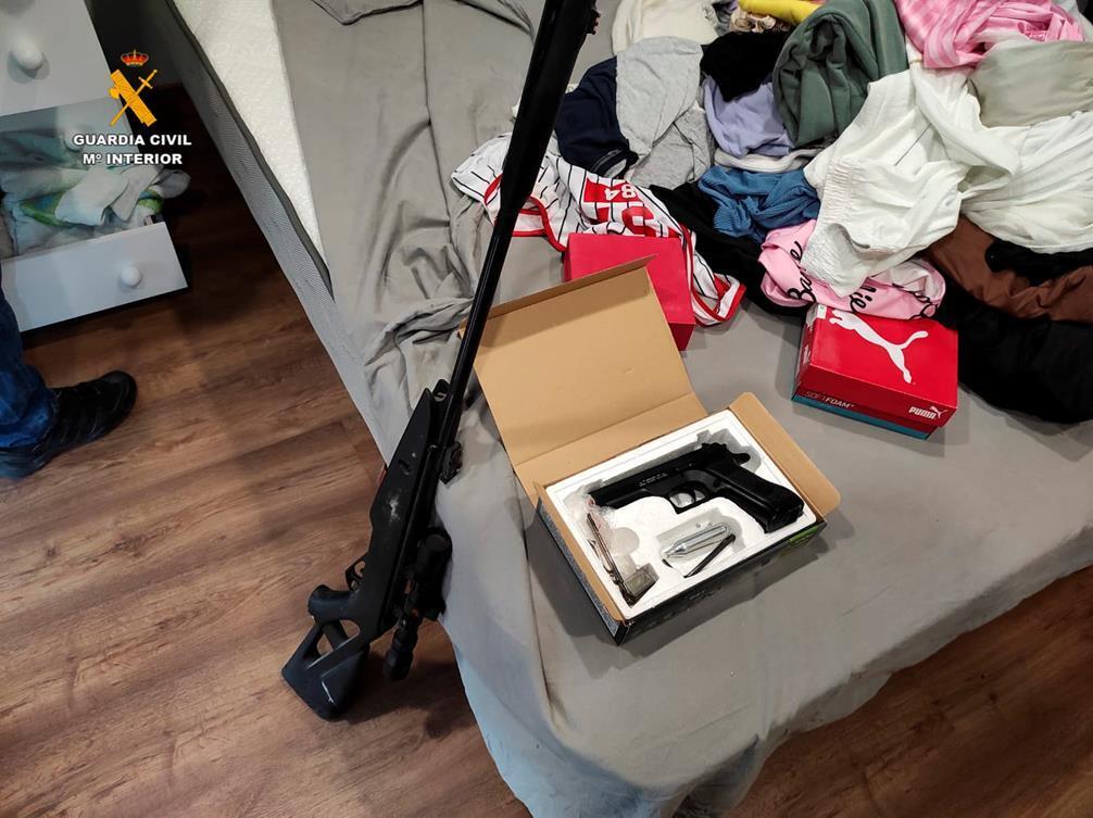 Durante los registros se les intervino una pistola de nueve milímetros con el número de serie borrado y en perfectas condiciones de funcionamiento, una pistola simulada, dos carabinas y una pistola de aire comprimido, una defensa extensible, un bate de béisbol, un vehículo de alta gama que previamente había tenido que entregar la víctima como adelanto del pago requerido y que los investigados pretendían vender, diverso material informático, teléfonos móviles, tarjetas telefónicas de interés para las investigaciones y varias nóminas falsificadas que uno de los miembros del grupo utilizaba para adquirir productos de crédito y el alquiler de la vivienda en la que residía.