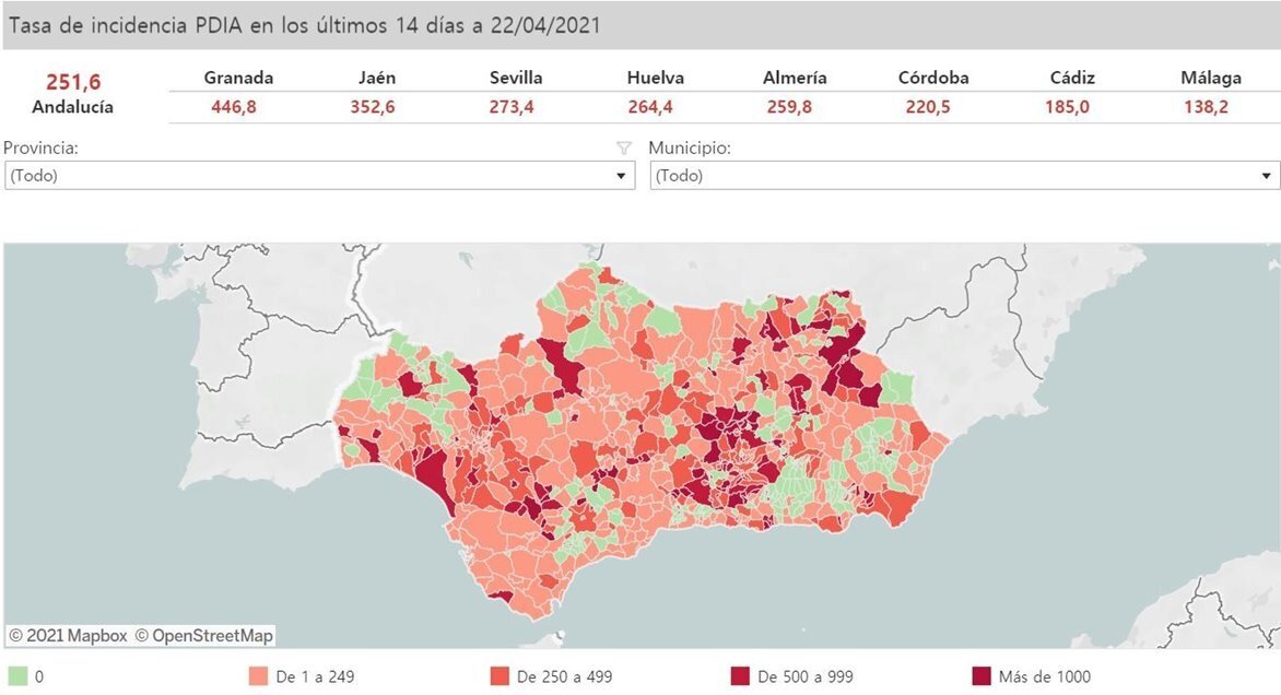 Igualmente, todas las provincias salvo Córdoba registran localidades con suspensión de toda actividad no esencial por superar el millar de contagios por cada 100.000 vecinos en los últimos 14 días, lideradas por Granada, con 21, seguida de Jaén con diez, Cádiz con cinco, Málaga con tres, Sevilla con dos y Almería y Huelva con una cada una.