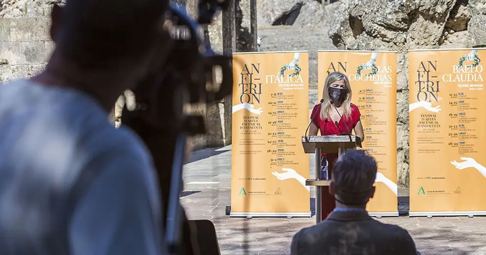 La consejera de Cultura y Patrimonio Histórico, Patricia del Pozo, ha presentado el nuevo festival de las artes escénicas andaluzas, 'Anfitrión', que se celebrará a lo largo de los meses de julio y agosto en los teatros romanos de Itálica (Sevilla) y Baelo Claudia (Cádiz), en la Alcazaba de Almería y en las Cocheras del Puerto de Huelva, con el propósito de reactivar al sector de forma inmediata y favorecer el reencuentro entre el público y los creadores andaluces.