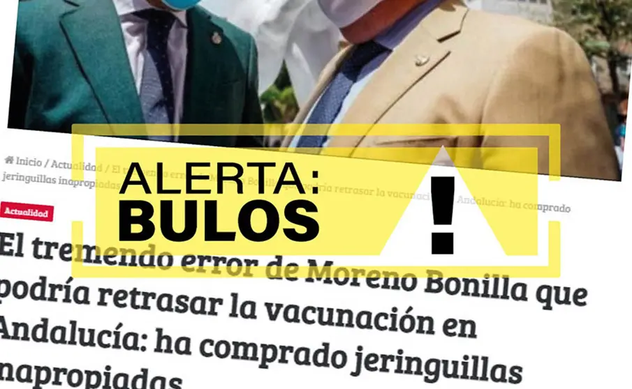 Ante las malintencionadas informaciones recientes que intentan crear polémica y confusión, la Junta de Andalucía manifiesta que "es falso que la Consejería de Salud haya comprado jeringuillas equivocadas para la vacuna de la Covid". Aseguran que "la Consejería de Salud ha realizado con antelación una compra extraordinaria de jeringuillas de diferentes modelos para los viales multidosis que puedan necesitarse". A través de un comunicado lamentan que una página web está difundido una noticia manifestando que la Junta de Andalucía ha adquirido jeringuillas equivocadas para la administración de la vacuna de la Covid-19. Quieren hacer ver que esta falsa circunstancia podría poner en peligro la campaña de vacunación. Esa noticia es falsa, y así lo confirma la Consejería de Salud y Familias de la Junta de Andalucía.