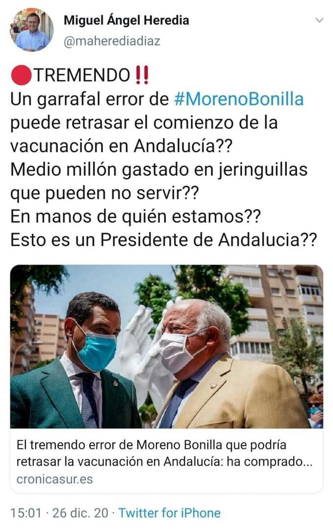 A su vez, Miguel Ángel Heredia, Senador por el PSOE de la provincia de Málaga, también compartió la falsa noticia. Conocido recientemente tras denominar "niños pijos" a los estudiantes de la escuela concertada, publicó un mensaje creando alarma entre los ciudadanos: "¿En manos de quien estamos? Un error de Juanma Moreno puede retrasar el comienzo de la vacunación en Andalucía". Hay que reseñar que tras hacerse público que estaban mintiendo a los ciudadanos, Heredia borró el mensaje en Twitter.