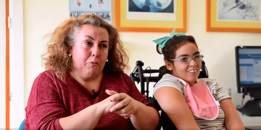 Ella, María, se desplaza en una silla de ruedas y apenas habla, se alimenta (incluido el agua y cualquier líquido) por una vía en el estómago y tiene un nivel académico similar al de un alumno que se inicia en Primaria. Ahora, por ejemplo, acaba de aprender a distinguir los colores y las formas geométricas básicas.
