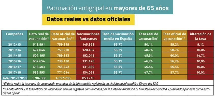 Las cifras han sido manipuladas según la Junta de Andalucía hasta hace unos meses que los socialistas permanecían en el Gobierno. El equipo de Susana Díaz informó ante la prensa y el Ministerio de Sanidad que en el invierno del 2017 al 2018 las mujeres embarazadas habían sido vacunadas casi un 8% más de los datos reales, un 11% más de personas mayores de 65 años.