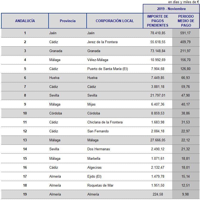 Este podría ser el caso de los consistorios de Jaén y Jerez, los cuales encabezan la lista en negativo a la hora de pagar, llegando a tardar casi 600 días en el caso del jiennense, y 410 en el del jerezano, es decir casi 20 y 16 meses respectivamente.