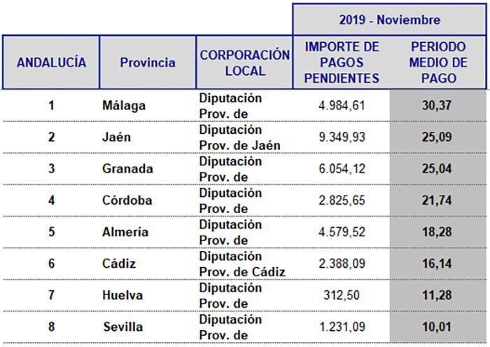 Las Diputaciones andaluzas abonan los servicios prestados en menos de 30 días, destacando Almería, Cádiz, Huelva y Sevilla, que lo realizan en menos de 20 días.