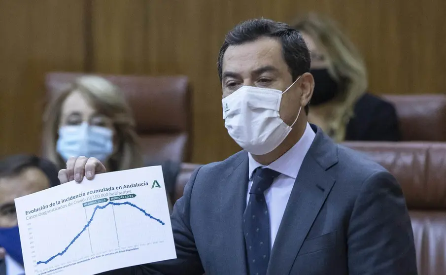 Juanma Moreno continúa apostando por un confinamiento domiciliario según ha podido saber ELMIRA.es. El presidente de la Junta de Andalucía, Juanma Moreno, ha observado este jueves "con expectación y con esperanza" que el número de contagios de covid-19 en la región "va bajando" de manera progresiva; si bien cree que es pronto para determinar si se ha "doblegado la curva"; toda vez que augura unos "diez o doce días muy duros" en relación a las hospitalizaciones. Por lo que ha insistido nuevamente en que el Gobierno central le dé la competencia para decretar el confinamiento domiciliario y actuar así en determinados municipios o regiones.