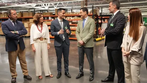 Durante la visita a la Colmena, Juanma Moreno, en compañía del director de Relaciones Externas de Mercadona en Andalucía, Ceuta y Melilla, Diego Ortiz; y el director de la Colmena en Sevilla, Víctor Sánchez, ha podido conocer de primera mano el funcionamiento del negocio online de Mercadona, puesto en marcha hace seis años.