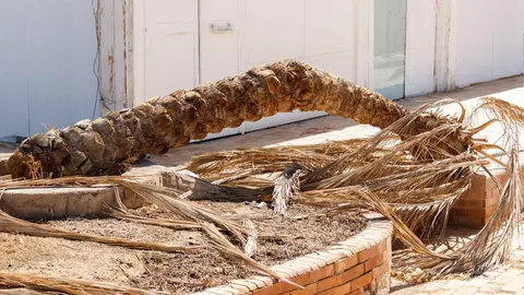 Finalmente, la copa de la palmera quedó segada del tronco, justo sobre el tejado del edificio de dos plantas donde se encuentra situado el bar, concretamente en la esquina de la calle Puerto Escondido y Ribera del Marisco