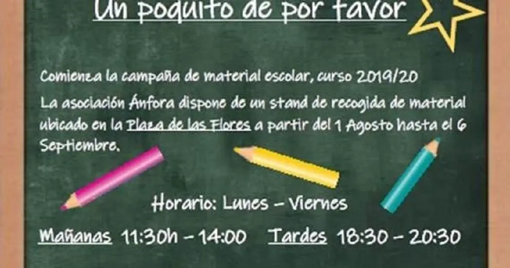 Este tiempo de estío es aprovechado para poner campañas con el loable objetivo de ayudar a las familias que más lo necesitan a disponer del material escolar necesario para el inicio del curso en el mes de septiembre.