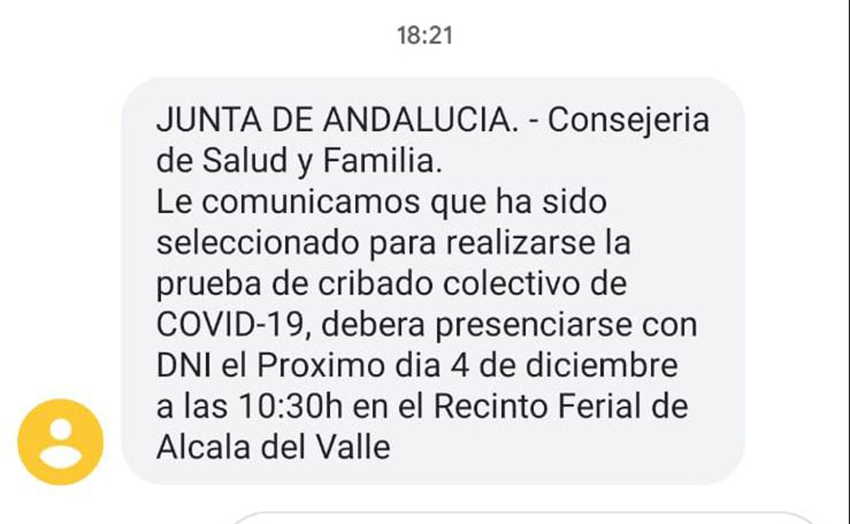 Vecinos de esta localidad están recibiendo desde hace varios días en sus móviles mensajes SMS en los que se les informa de que han sido seleccionados para realizarse test de antígenos. En esos mensajes se les comunica que deberán presentarse con su Documento Nacional de Identidad a las 10:30 horas desde este vienres, 4 de diciembre, en el Recinto Ferial. Es absolutamente falso.