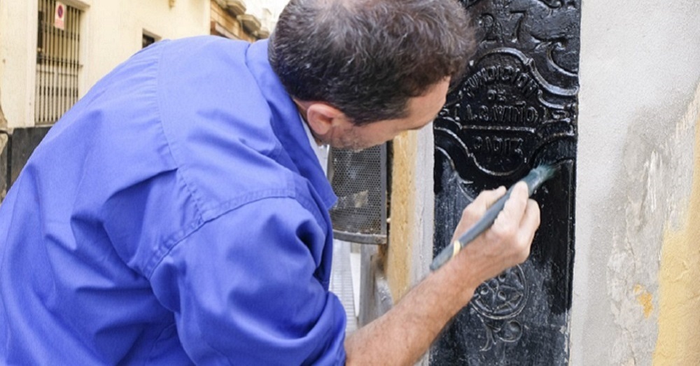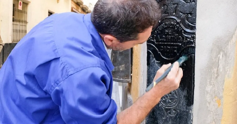 De manera coordinada, las delegaciones municipales de Patrimonio Histórico y Mantenimiento Urbano están realizando un proceso de recuperación de estas piezas que consiste en el desarrollo de un tratamiento de choque en los cañones y placas de fundición de los guardacantones.