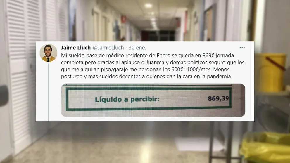 Lluch afirma en su tweet: "Mi sueldo base de médico residente de Enero se queda en 869 Euros para jornada completa. Pero gracias al aplauso de Juanma y demás políticos seguro que los que me alquilan el piso y el garaje me perdonan los 600 +100 Euros al mes. Menos postureo y más sueldos decentes a quienes dan la cara en la pandemia".
