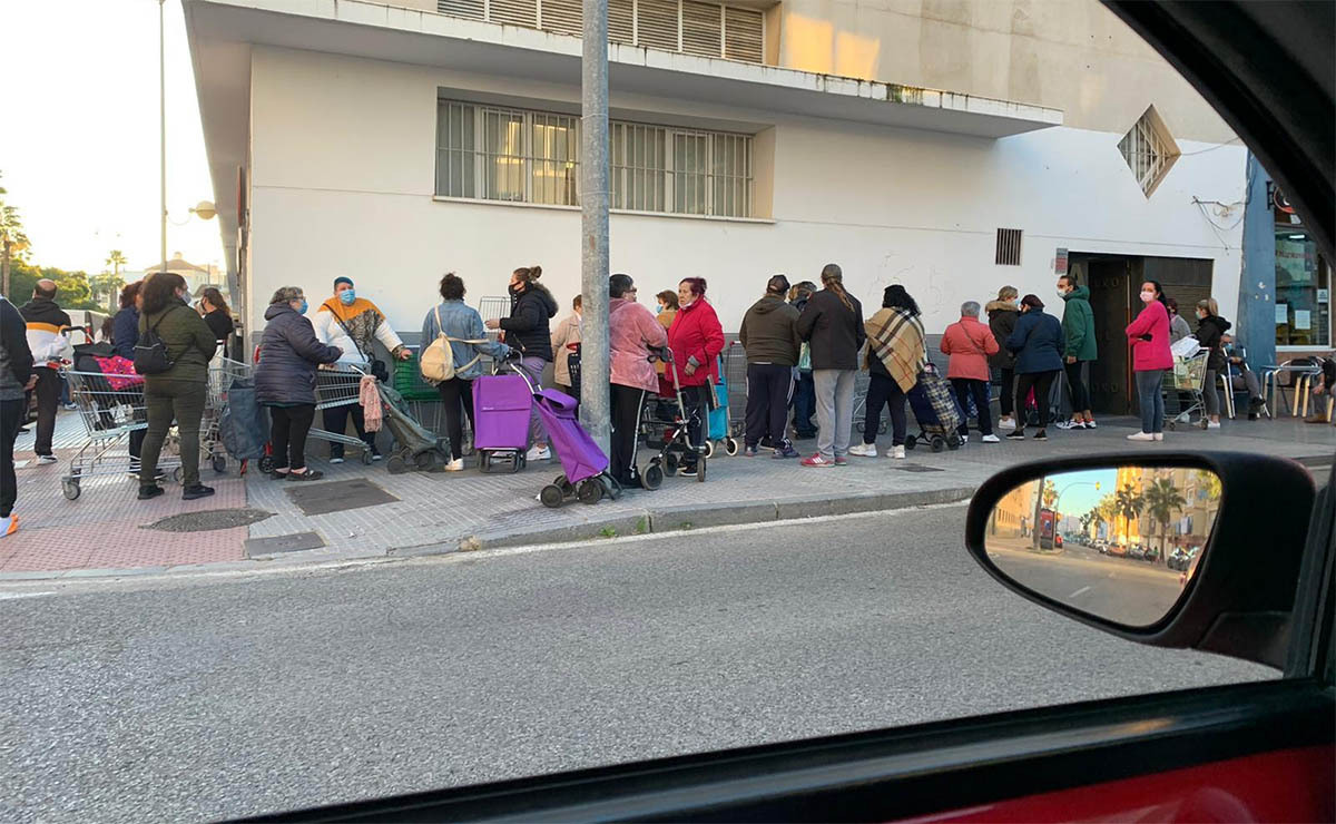 Colas de familias sin recursos solicitando alimentos de primera necesidad en la avenida Lacave, en Cádiz