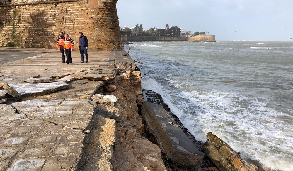 La gran borrasca Emma que azota estos días la ciudad ha causado varios destrozos esta pasada madrugada, como el derrumbe de la muralla de San Felipe o de parte del murete del Paseo Fernando Quiñones.