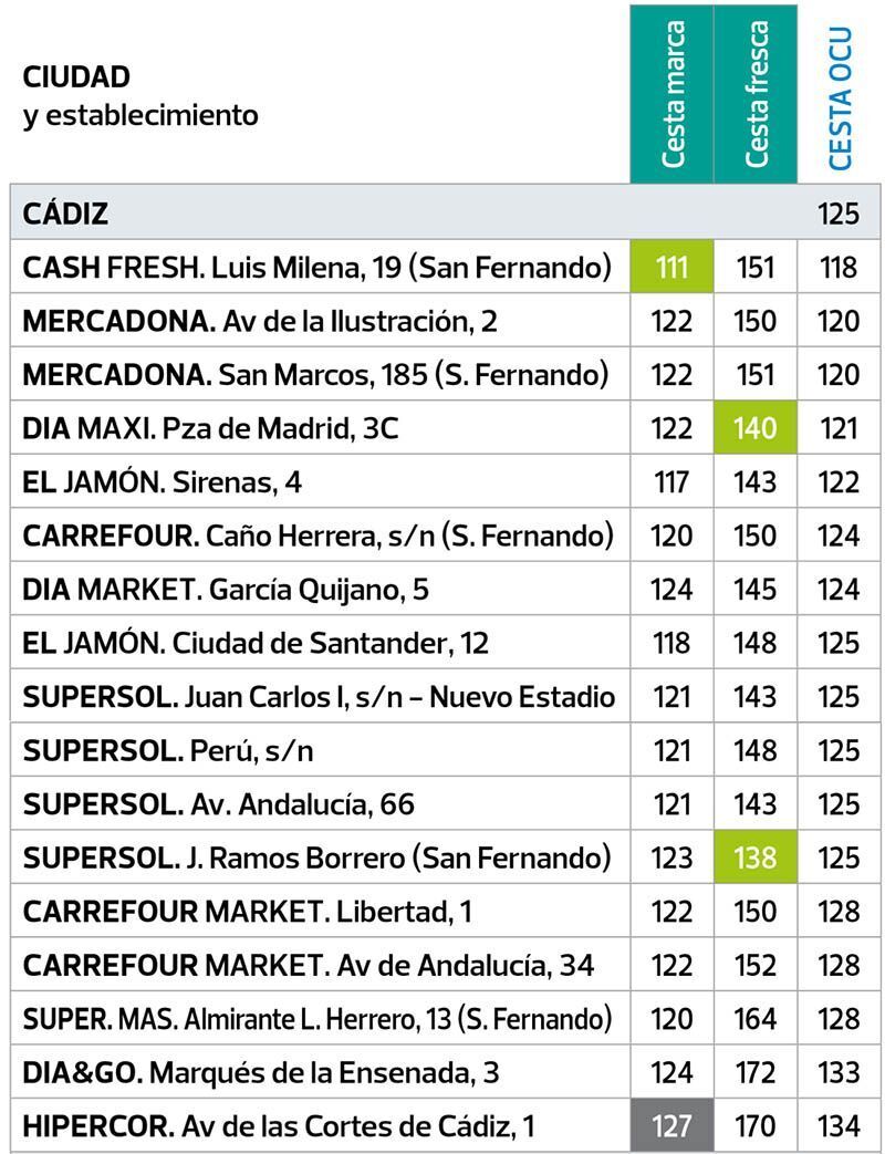 La Organización de Consumidores y Usuarios (OCU) vuelve a realizar su ranking habitual de comercios más baratos a través de las “compras de siempre”, es decir, los alimentos frescos y envasados, así como los productos de droguería e higiene que compramos cada año para abastecer nuestros hogares. Entre los supermercados más económicos de la provincia de Cádiz se encuentra la cadena española Mercadona, figurando entre los más económicos la ubicada en la Avenida de la Ilustración de Cádiz, y la de San Marcos, en San Fernando.