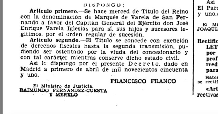 Y los méritos por los que se otorga son los siguientes: "La vida militar del Capitán General del Ejército don José Enrique Varela Iglesias constituye desde su iniciación hasta el día de su fallecimiento una serie ininterrumpida de servicios extraordinarios y acciones distinguidas. Con sobria exactitud puede afirmarse que en los acontecimientos más trascendentes de nuestra historia durante los últimos treinta años el nombre del ilustre soldado se destaca a la luz que irradia el cumplimiento del deber y la lealtad a los sentimientos del honor y del patriotismo. África, en los tiempos de lucha primero y en los de paz después, ha conocido de su heroísmo y de su capacidad política, de igual manera que en nuestra Cruzada liberadora las extraordinarias cualidades castrenses del General Varela encontraron ancho campo y múltiples ocasiones de exteriorizarse. En justo homenaje, pues, a su memoria y a la gratitud nacional que les es debida...".
