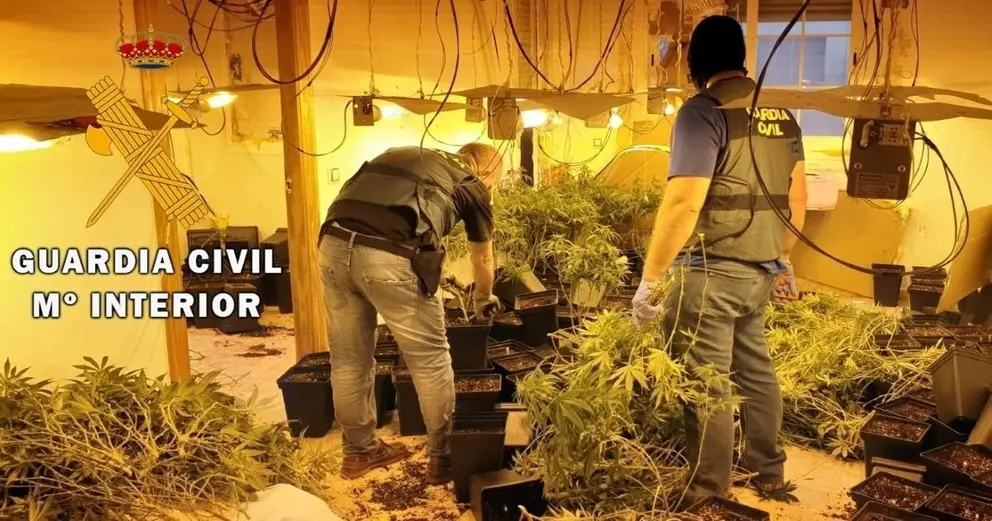 Agentes de la Guardia Civil ha desmantelado en Arcos de la Frontera una plantación de marihuana. Dicha plantación se había instalado en el interior de la vivienda de una finca. Los agentes, que han detenido a los dos propietarios, han hallado más de 500 plantas con un peso de más de 55 kilos.
